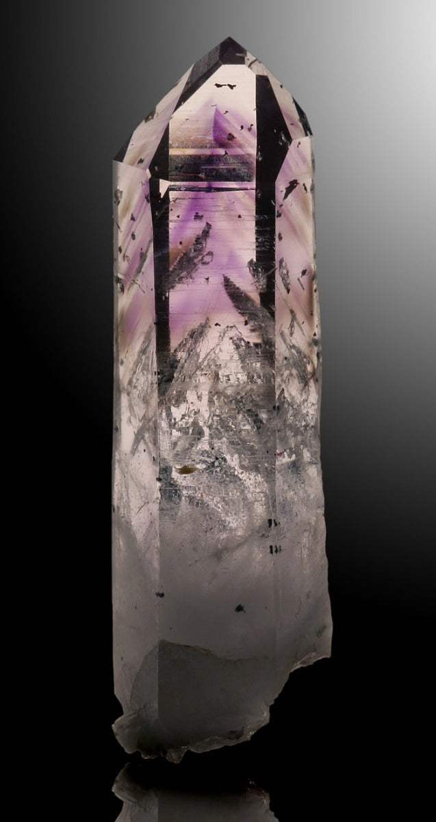 Phantom Quartz is created when minerals have been washed over and captured within a crystal during its growing process. The mineral deposit acts as a record of the crystal's lifetime. Phantoms appear as ghost crystals, or faint lines that mimic the shape of the main termination of the crystal. Phantom colors vary depending on the mineral which is captured. Very frequently, these phantoms are chlorite, hematite, or clay. Another way that phantoms can be formed is through natural irradiation, or a temporary increase in temperature during the growing process. The increase in temperature results in deeper or more vivid colors especially in smokey quartz and amethyst.