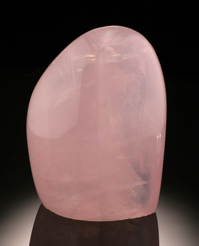 Flat-cut base, free-form rose quartz with light pink hue and interesting internal fractures.