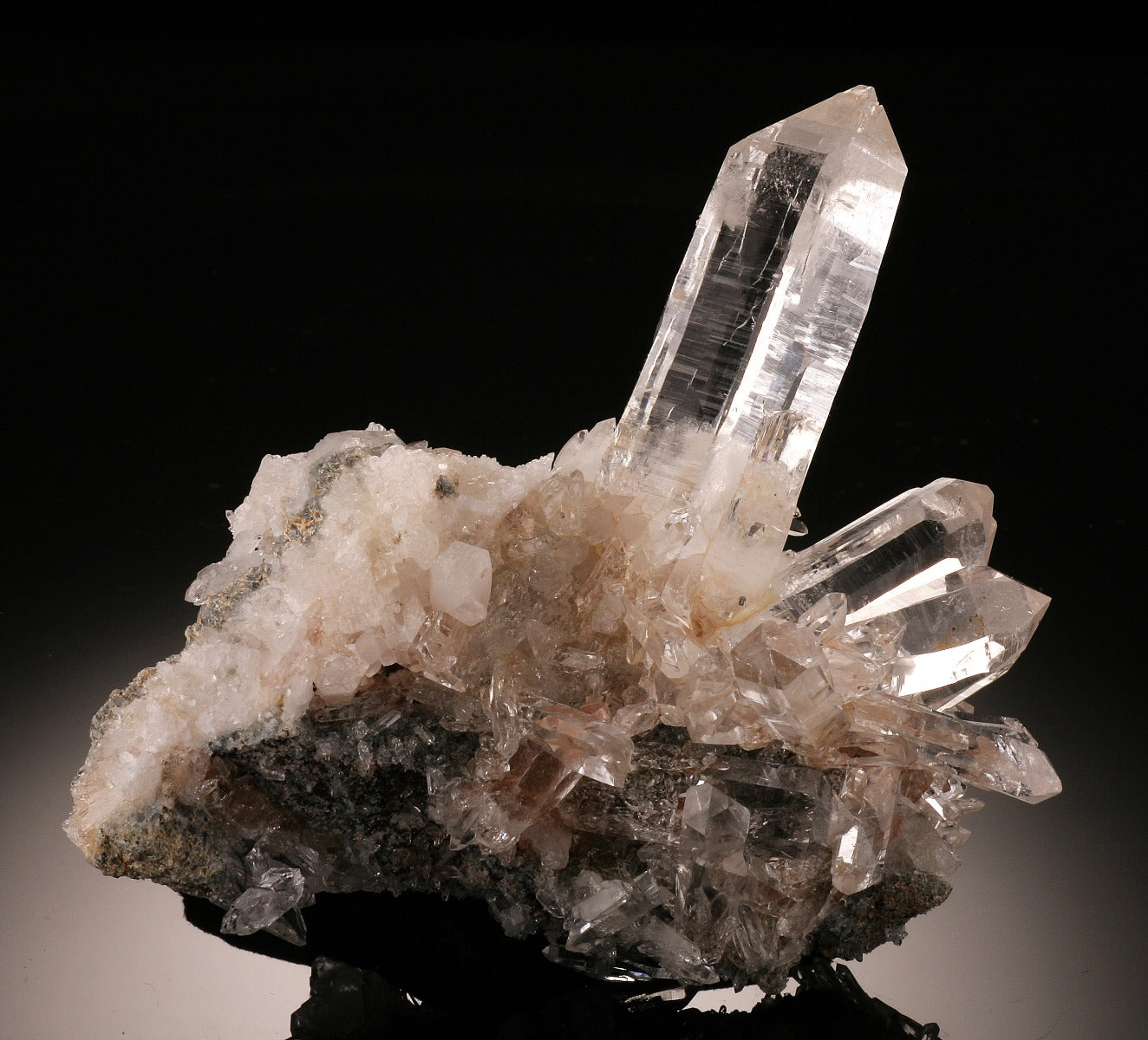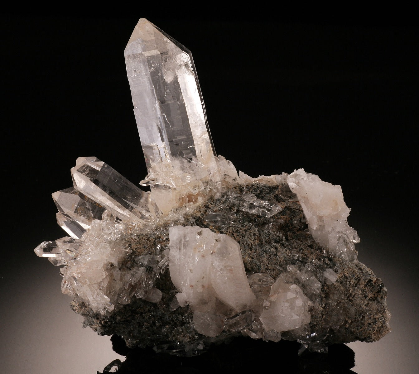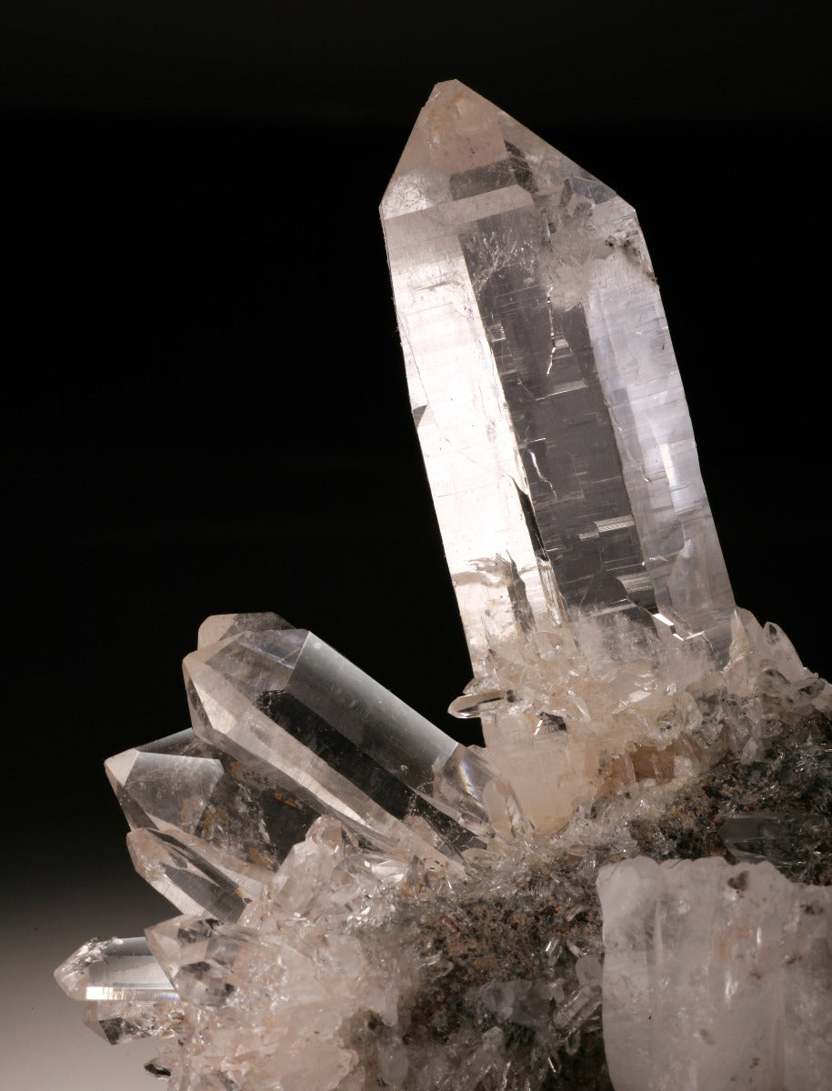 A great formation of very clear and lustrous crystals in matrix. The focal point is the largest crystal, standing at 2-3/4" long. Along one side is another "burst" of crystals that are about 1-1/2" long and smaller. While the main crystal has a small chip on the termination, it does not take away from the aesthetic value of the piece at all.