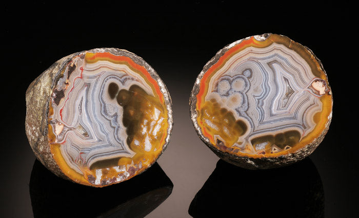 A single geode that has been cut in half and polished to show the awesome color and banding. The colors are natural and vivid; Agates from this rare location tend to have richer and brighter colors than typical Brazilian agate. This specific pair has wonderful thin-lined patterning and bright orange color around the outside edge.