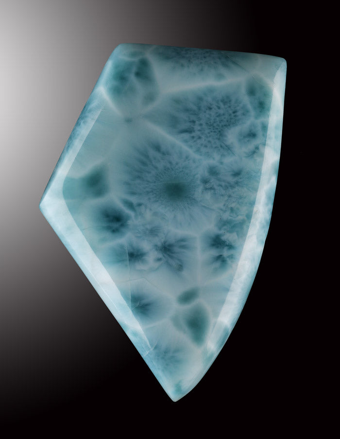 Larimar is a rare variety of pectolite found only in the Caribbean island of the Dominican Republic. Pectolite is an acid silicate hydrate of calcium and sodium, and the rare blue color of Larimar comes from cobalt substituting calcium. Ranging from light green-blue to deep blue, it is considered an ornamental and semi-precious stone. The first documented discovery of the stone dates to 1916, by Father Miguel Domingo Fuertes Loren. Permission to explore this new vug was denied to Father Loren, but luckily Miguel Mendez and Norman Rilling rediscovered the stone in 1974. These men named the blue pectolites “Larimar” by combining the name of Mendez’s daughter, Larissa, and the Spanish word for sea, mar. Good Larimar stones resemble the surface of the beautiful Caribbean Ocean where they are found