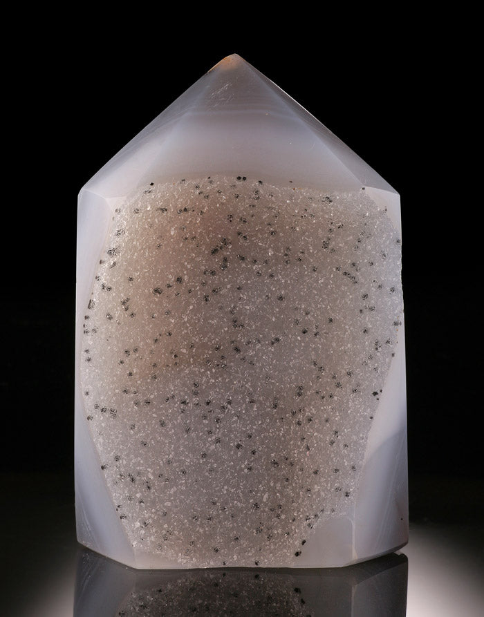 Agate is a form of Chalcedony, made up of 90% quartz and 10% morganite. It is composed of microscopically fine fibrous crystals, and it normally shows color banding, stripes, whirls, bull's eye and other random patterns due to impurities in the quartz. Igneous rock is formed by lava and volcanic activity. This activity can form pockets / bubbles in the rock, similarly to Swiss cheese. When these pockets are formed in an area close to water, the water which is filled with minerals, (primarily quartz), is forced into the pockets, forming a layer of gel which eventually eats away the igneous rock. Layer upon layer of this gel is created until the void is filled and the water dries out, allowing for complete crystallization. These pockets can be broken up over time, then washed into the waterways, where it can be naturally smoothed and polished. Sometimes it will remain intact, and a void will not fill completely, as in the case of an Agate Geode. Agates were first discovered along the river Achates, in Sicily, for which they are named.