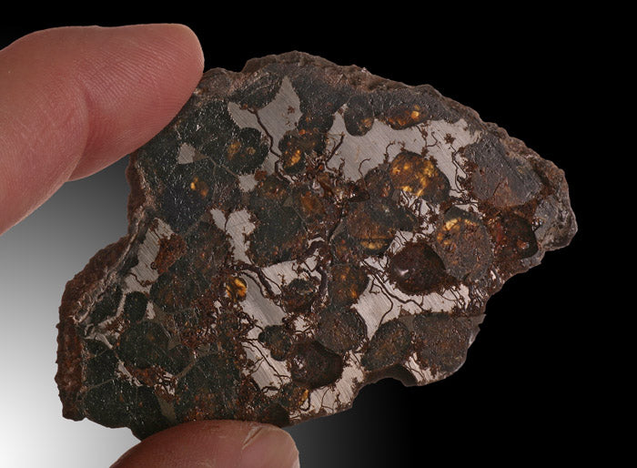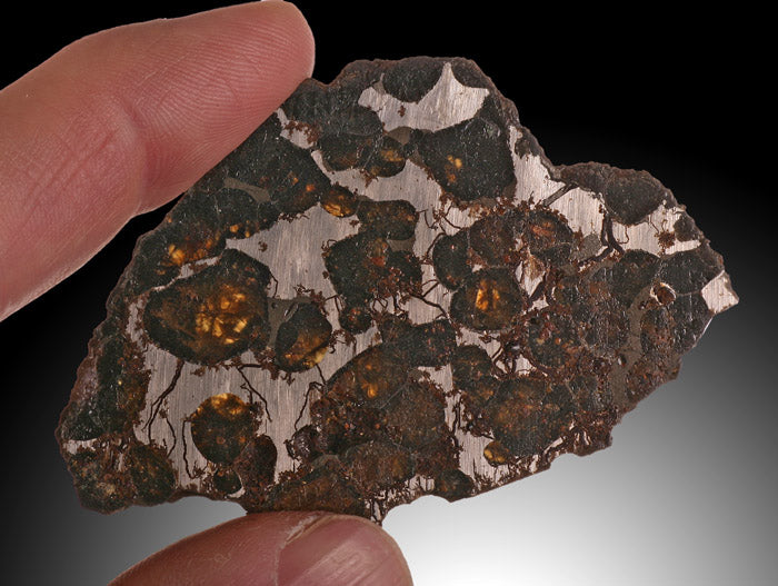 Brahin is in the pallasite class of meteorites which only represents about 0.2% of all meteorites. These meteorites were found in Byelorussia in 1810. After forming in the asteroid belt billions of years ago, other rocky masses impacted the pallasite / planetesimals, scattering its fragments,sending some of them to Earth. Earth formed in the same way as the above planetesimals, but on a much larger scale and was not impacted to to point of destruction. While still in its molten state, the Earth escaped the asteroid belt and began its rotation around the Sun, slowly completing its spherical form and began to cool. Because Pallasites are similar to the mineralogical composition of Earth they can be useful in researching Earth's geology.
