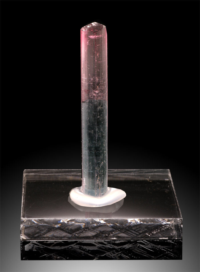 Albite (Elbaite) also known as Tourmaline is a group of mixed crystals with the following major members, Elbaite, Dravite, Schorl, Buergerite, Tsilaisite, and Uvite. The general color range of the mineral's family are colorless, pink, green, blue, yellow, brown, and black. What distinguishes tourmalines are the three-sided cross sections that are different than any other mineral.