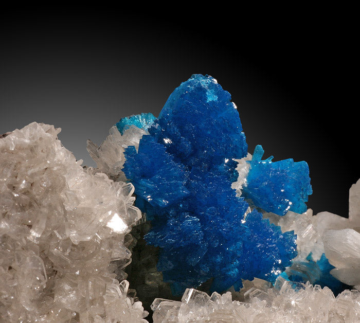 Cavansite is a rich blue mineral named for its chemical composition, calcium vanadium silicate. The crystals are orthorhombic structures that commonly form with stilbite, pentagonite, heulandite, mordenite and other minerals, found in India, Iceland, and the United States.The chemical formula for cavansite is Ca(VO)(Si4O10) 4H2O. As minerals go it is a young find, having been first discovered in Malheur County, Oregon in 1967 (just 3 years before our shop opened). Cavansite most often forms in small, spherulitic rosettes composed of many tiny, radiating crystals. It is now found primarily in a few localities in India, and continues to be quite rare.