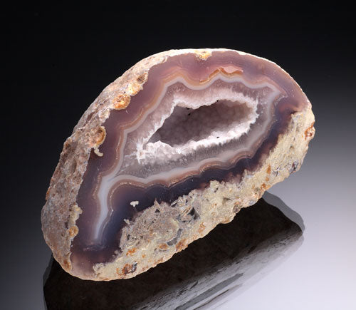 Geodes are spherical to free form shaped rocks which begin formation as a hollow bubble inside a layer of rock. The bubble normally forms in a gas bubble of a volcano's lava, or it could form within the hollow remains of animal burrows or tree roots. As an animal moves out of its burrow or a tree root dies, there remains a cavity surrounded by sediment hundreds of feet thick. The pressure of the sediment eventually causes the sediment around the void to turn into rock. Then, similarly to the geode created by lava, mineral rich water finds its way in and out of the now hardened bubble which allows for the formation of crystal inside the bubble. The crystal formations may be small in form, or may build into larger formations. Normally the mineral deposits are in the form of quartz or calcite. The deposits may be pure thereby creating clear crystallization, or they may have trace elements such as iron, manganese, sulfur, etc. If the formation inside the geode continues to fill it completely it is no longer a geode but becomes a nodule. Geodes are found around the world, with the abundance found wherever there was volcanic activity.