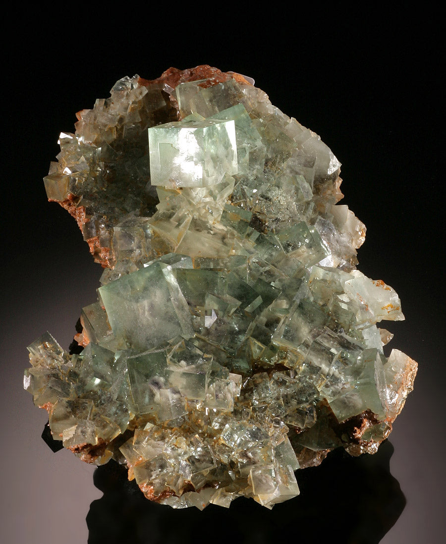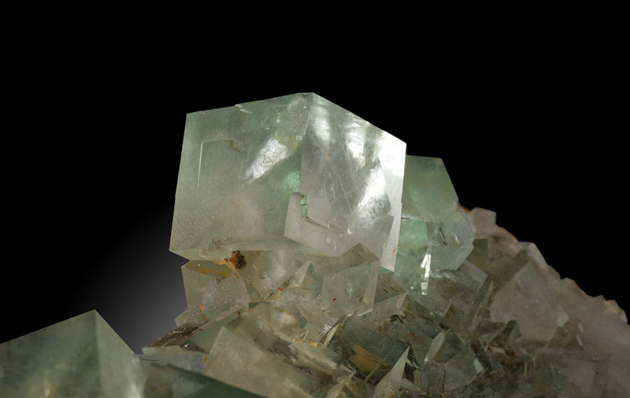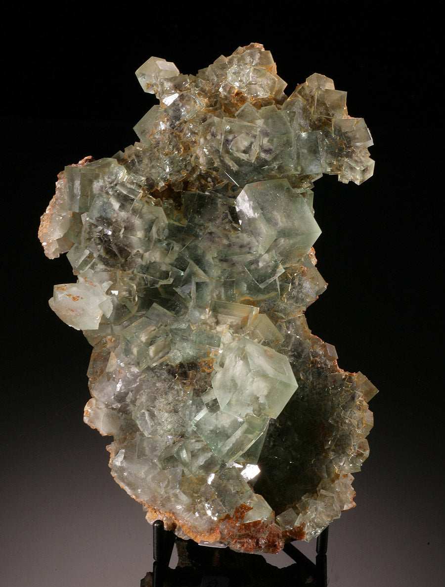 Displaying excellent clean and clear cube formations this fluorite specimen is amazing Te photos truly do not give it justice. The undulating pale green cubes make one realize that Mother Nature is the true creator of art. We almost passed on this specimen, due o its price point. But we simply couldn't pass it up. For the discriminating collector. It sits nicely on its own. But we are including a simple display stand, in case one wishes to elevate it slightly.