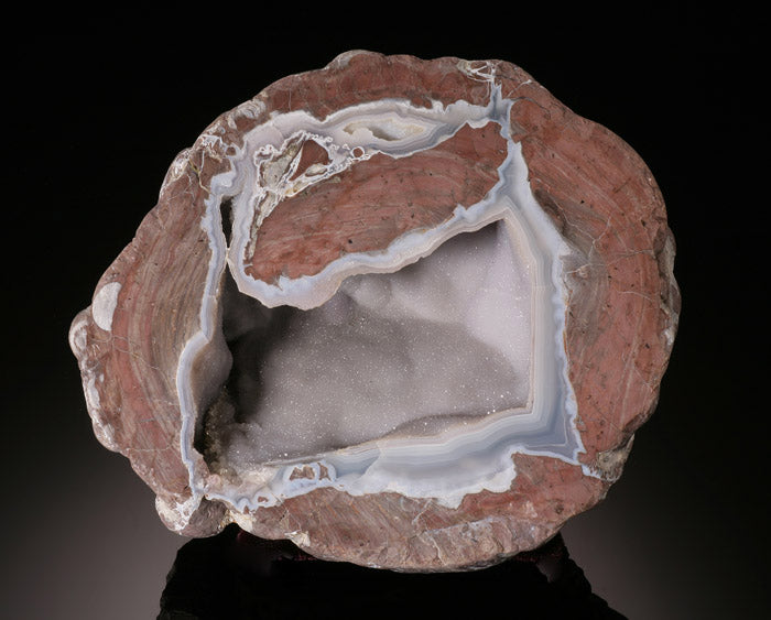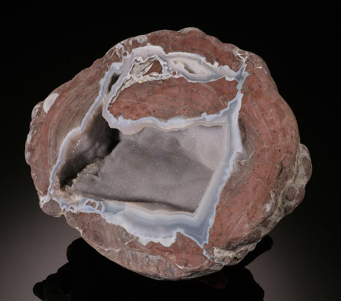 When volcanic activity occurred in what is now western Utah some 8 million years ago, deposits of the igneous rock rhyolite formed. As the rock cooled, pockets of volcanic gases became trapped and formed cavities. The circulation of groundwater allowed silica and other minerals to precipitate into these cavities and form layers of agate and crystal quartz over the course of millions of years. Today the result is a beautiful and unique variety of geodes known as Dugway Geodes, composed of banded agate and crystal quartz captured in rhyolite. They are found in western Juab Co., UT.