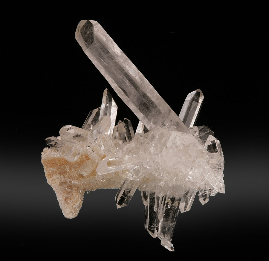 This is an exceptional formation of clear quartz from Tibet. The largest crystal measures nearly 6" in length, and sits on a bed of criss-crossed quartz crystals that seem to "burst" in every direction. There are even crystals growing down from what we would consider the base of the formation. The overall luster is top notch, and the terminations are clean and in tact. Truly a unique and aesthetically pleasing crystal cluster.
