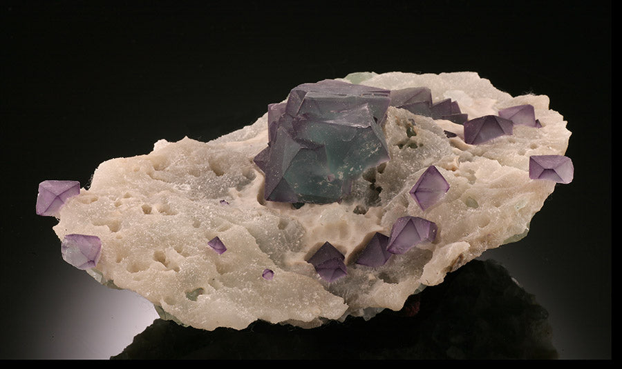 This fluorite cluster has nice green and purple crystals that pop against the white matrix. This is a great size and quality specimen from a well-known mine in China. Sold with a metal stand.