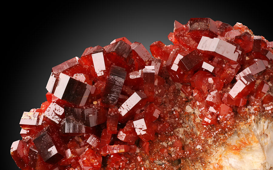 Vanadinite takes its name from the uncommon element that comprises it: Vanadium. It forms through the oxidization of lead-based minerals, oftentimes Galena, and only in dry conditions. Its high lead content, almost three quarters by weight, gives it a surprising density for a crystal that does appear metallic. Vanadinite is typically a brownish red color, though brighter reds and oranges are also possible. While the color of a Vanadinite specimen can be remarkable, the most striking feature is more often the shape. Vanadinite crystals form in near-perfect hexagons, yielding otherworldly patterns of repeated geometric shapes.