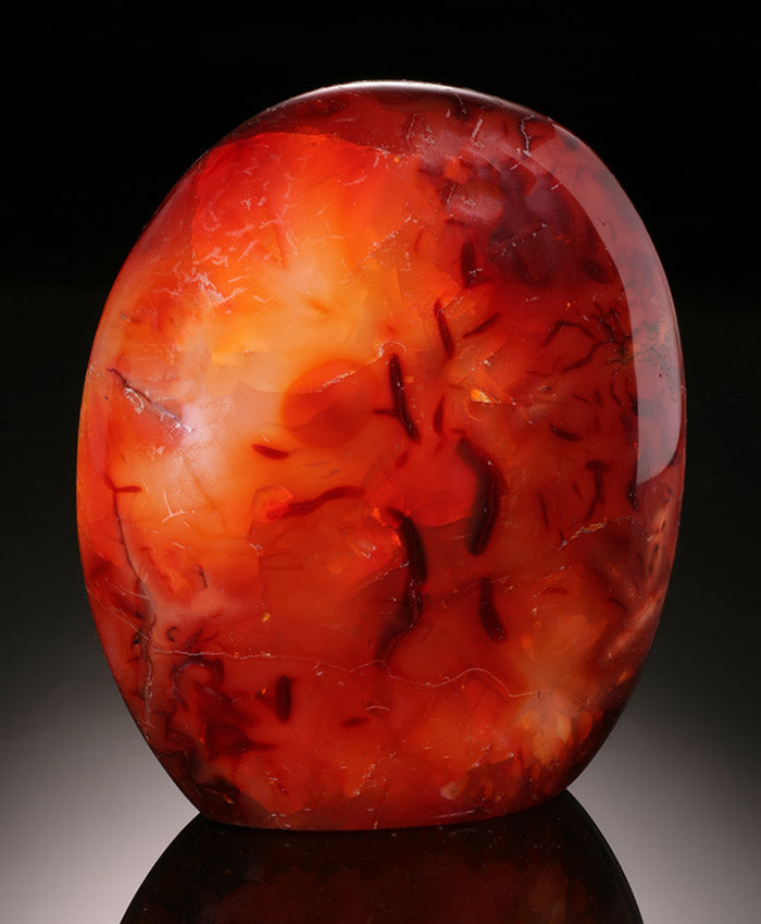 Polished carnelian with a flat cut base. This specimen has deep red and vivid orange coloration all the way around.