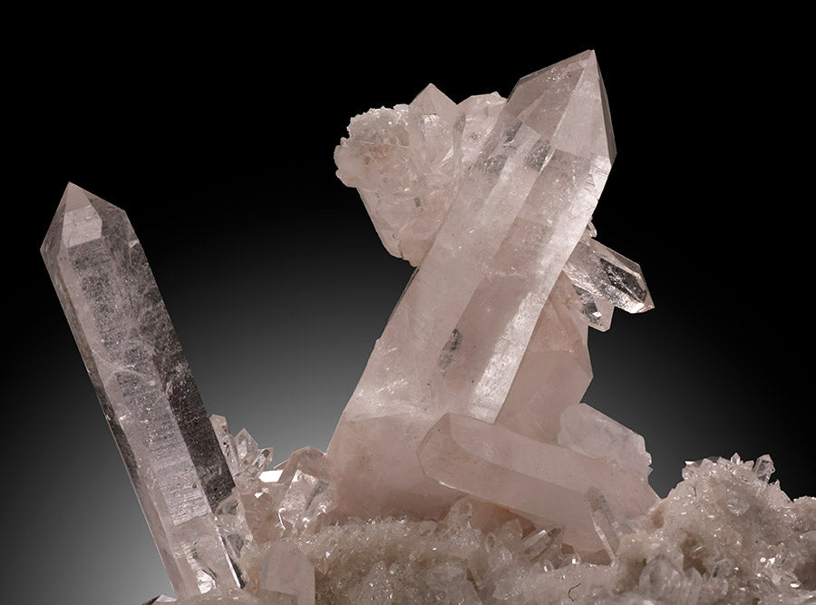 Pristine quartz cluster with a unique formation, especially along the largest “main” crystal in the cluster. It seems to be hodling up a smaller quartz cluster!