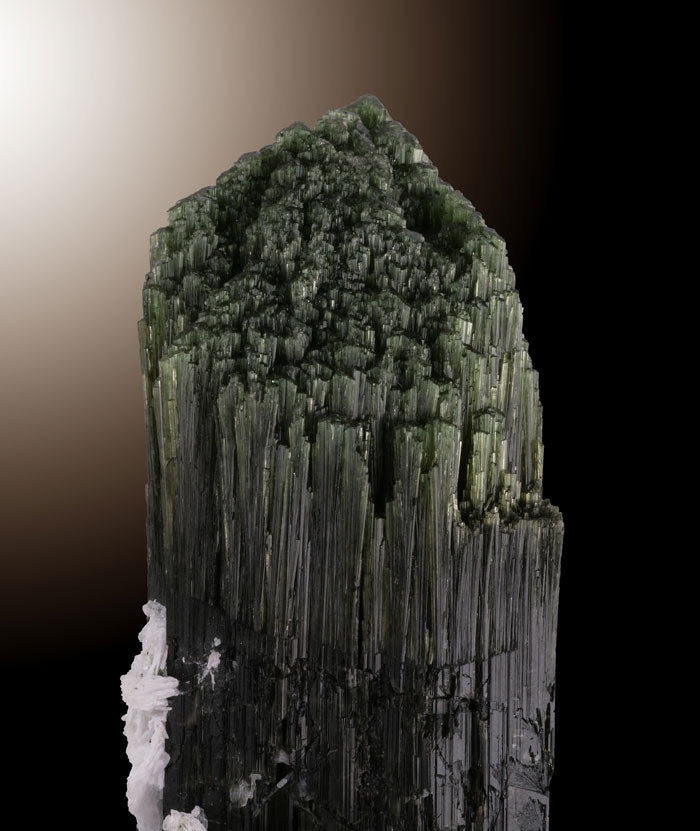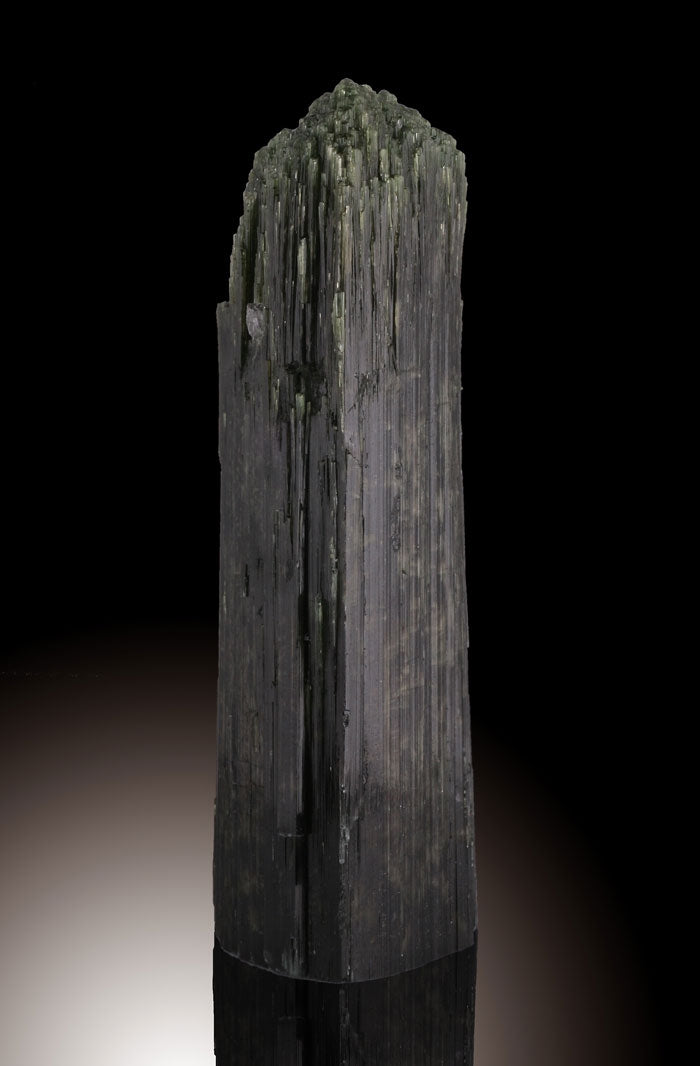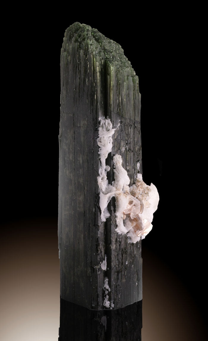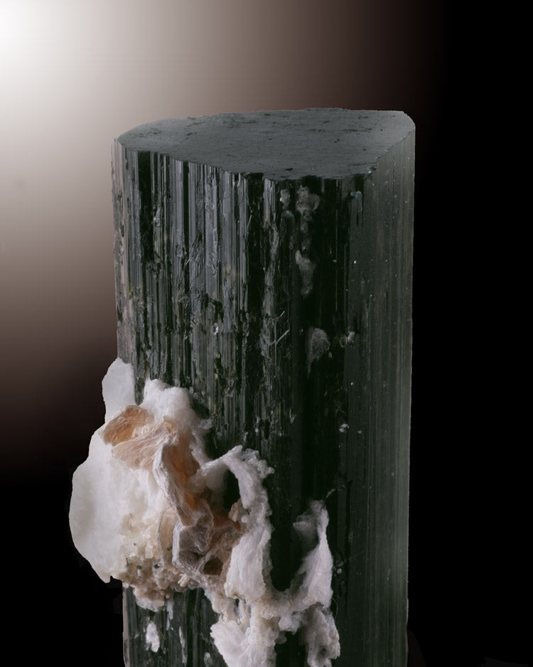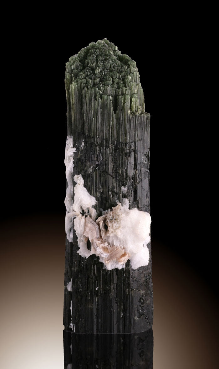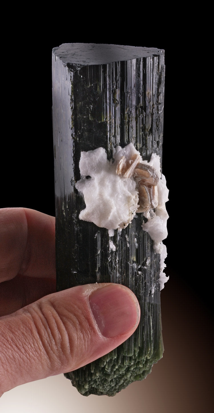 Albite,Elbaite, also known as Tourmaline is a group of mixed crystals with the following major members, Elbaite, Dravite, Schorl, Buergerite, Tsilaisite, and Uvite. The general color range of the mineral's family are colorless, pink, green, blue, yellow, brown, and black. What distinguishes tourmalines are the three-sided cross sections that are different than any other mineral.