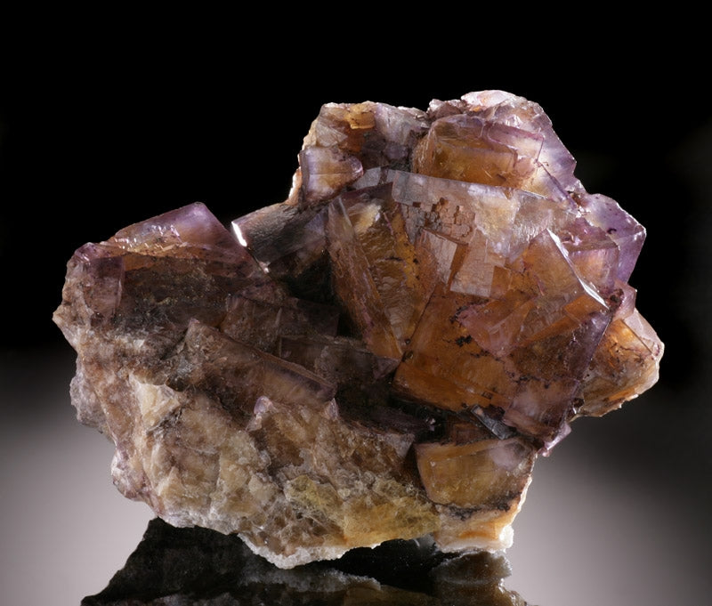 This rare fluorite specimen with bitumen inclusions features warm, oranges hues that contrast with purple points in a nice crystal structure./p>
