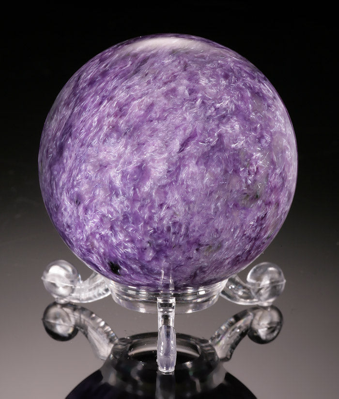 Charoite is a complex mineral of very rare occurrence. Heat, pressure, and infusion of unique chemicals into a rock is responsible for the transformations into new minerals such as Charoite. The colors in each piece of Charoite range from bright lavender, violet, and lilac to dark purple, with white, gray, and black veining. It forms a swirling pattern of interlocking crystals that often demonstrate chatoyancy. It is found only in the Murinskii Massif, about 70 miles from the Chara River in SW Yakutia, Russia. The name Charoite is created from the Russian word “chary,” which means charms or magic, due to its beautiful visual effect when polished.