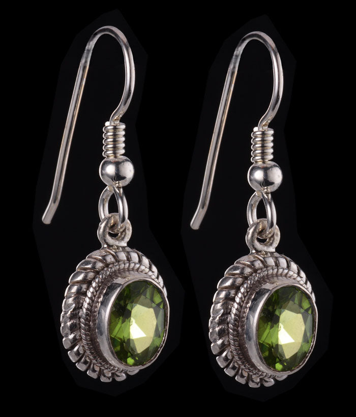 6x8mm oval cut peridot set in a sterling silver dangle, with a silver rope accent around the stone.