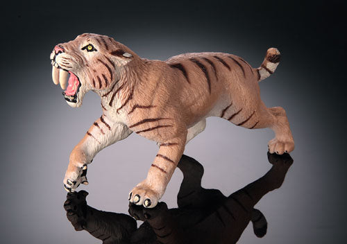 A saber-toothed cat/tiger is any member of various extinct groups of predatory mammals that were characterized by long, curved saber-shaped canine teeth. The large maxillary canine teeth extended from the mouth even when it was closed. The saber-toothed cats were found worldwide from the Eocene era to the end of the Pleistocene era (42 million years ago to approx. 11,000 years ago), existing for about 42 million years. One of the best-known Saber Tooth cats is the Smilodon.