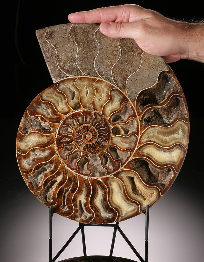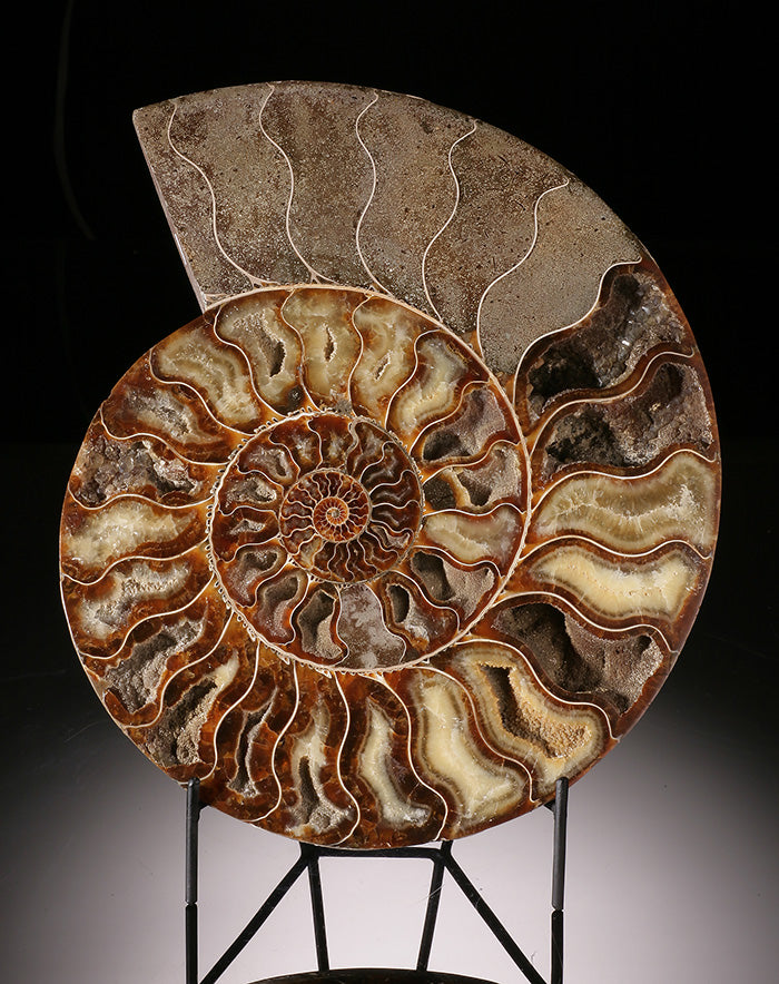Between 145 and 65 million years ago these extinct marine creatures, Cleoniceras cleon, flourished in a warm, shallow sea which covered much of the earth. As the shells of the creatures accumulated on the sea floor, they were buried by sediment and, over the ages, transformed into stone by physical and chemical processes. The chambers of the Ammonite acted as tiny geodes, allowing calcite to form crystals throughout.