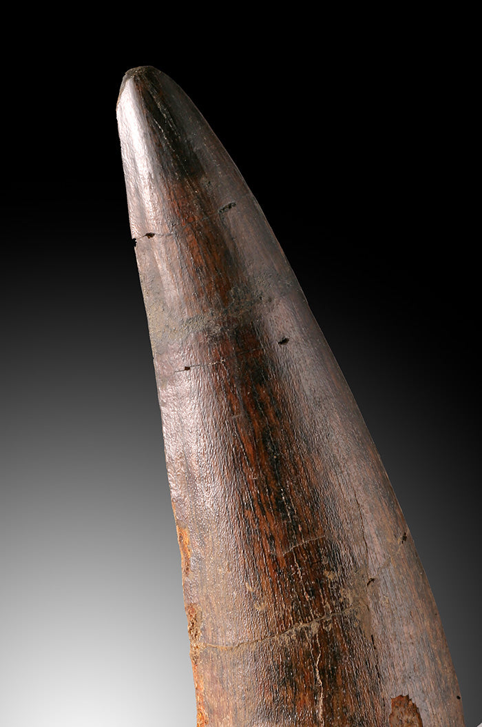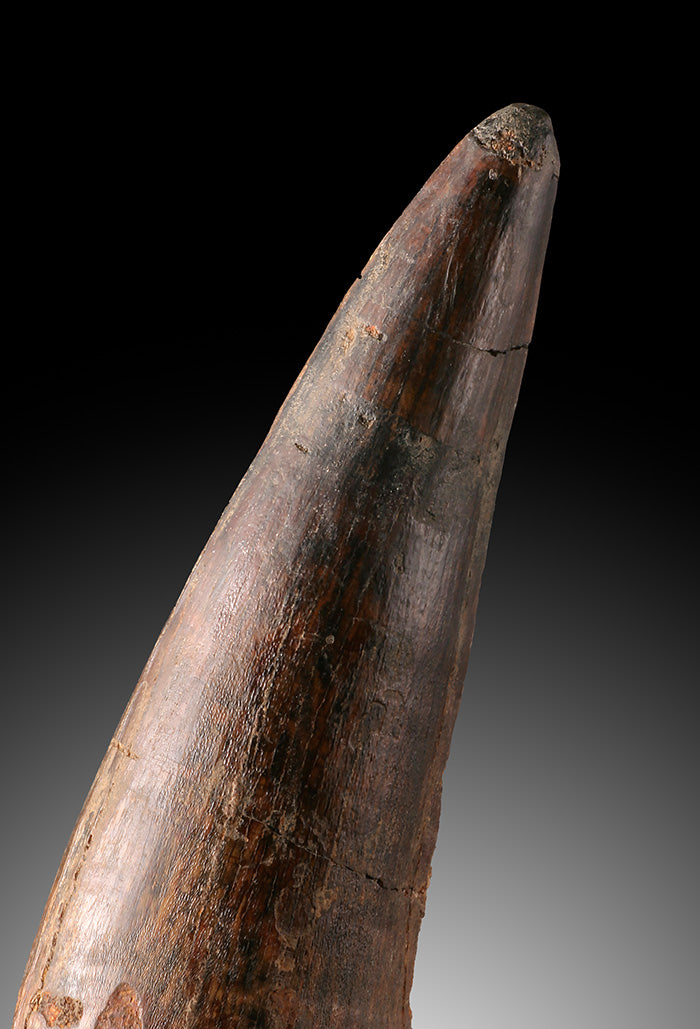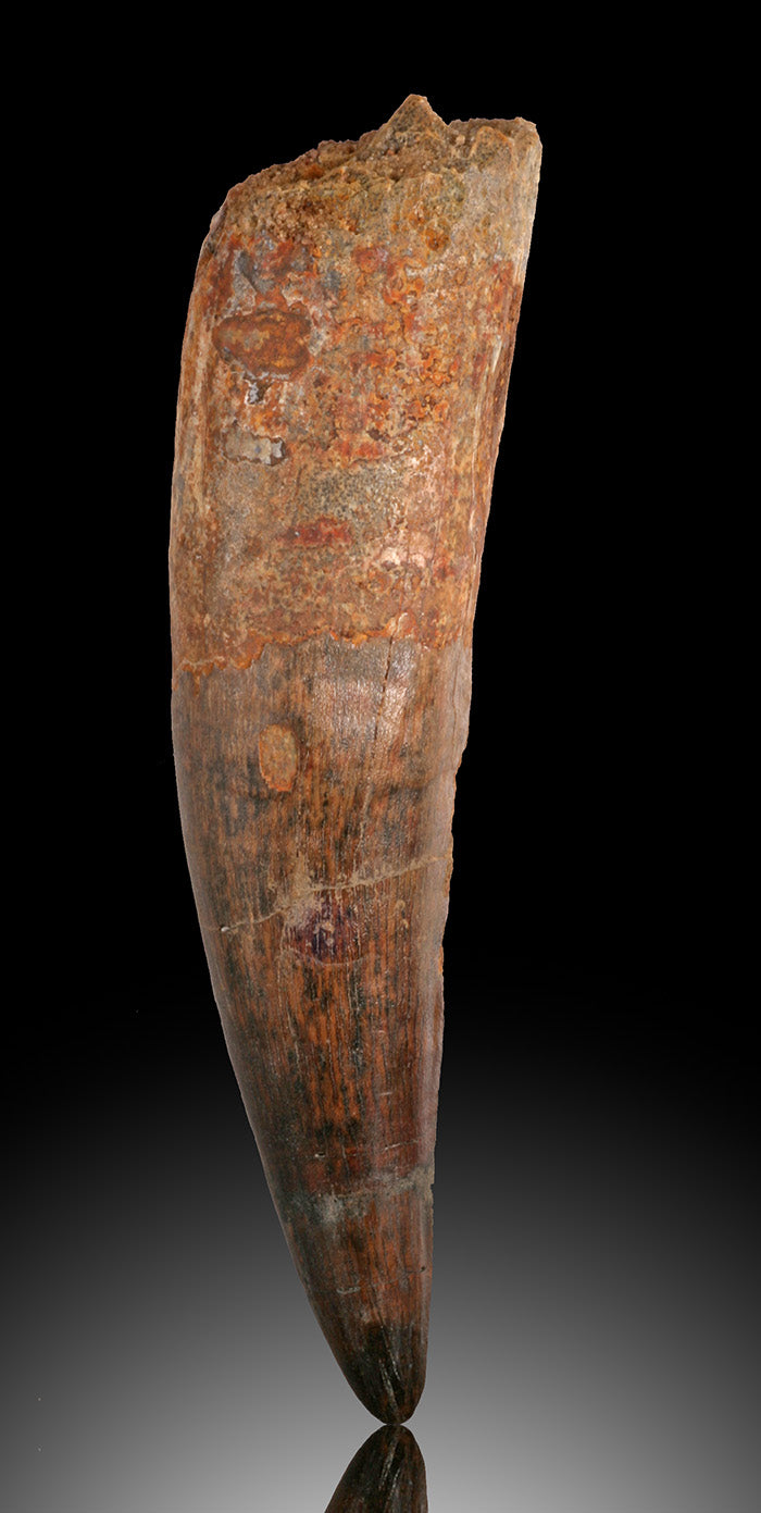 This is a very nice quality spinosaur tooth. It has a heavy and sturdy feel, as the root portion of the tooth is actually fossil tooth, and not just "shaped" matrix as sometimes seen on the market. The enamel luster is nice with a dark color, although there are some visible cracks (possibly restored), the structural integrity of the fossil is solid.