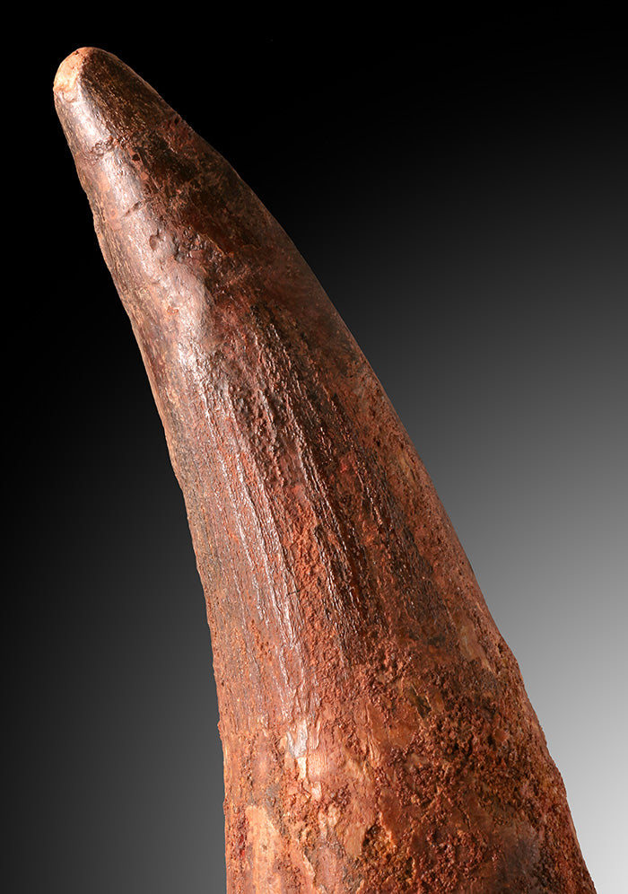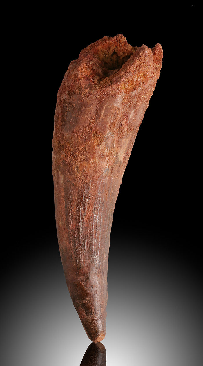 This fossilized spinosaur tooth has a nice shape and size with well preserved root extension.
