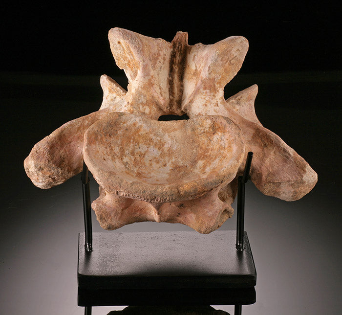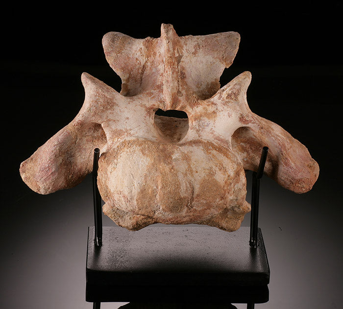 Large spinosaur vertebrae that has been well prepared and displayed in a custom made metal stand.