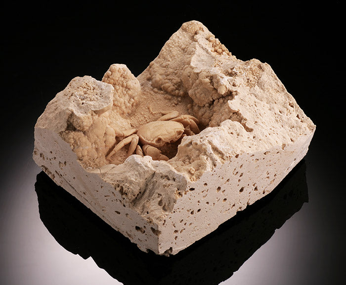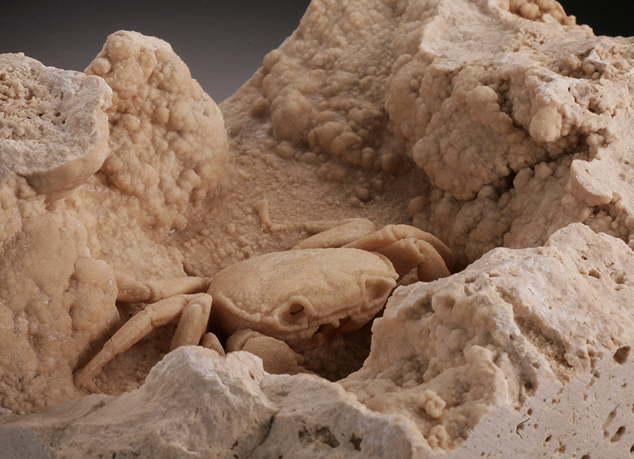2-¼" long fossilized crab that has been carefully carved out of its matrix, which resembles a cave house.